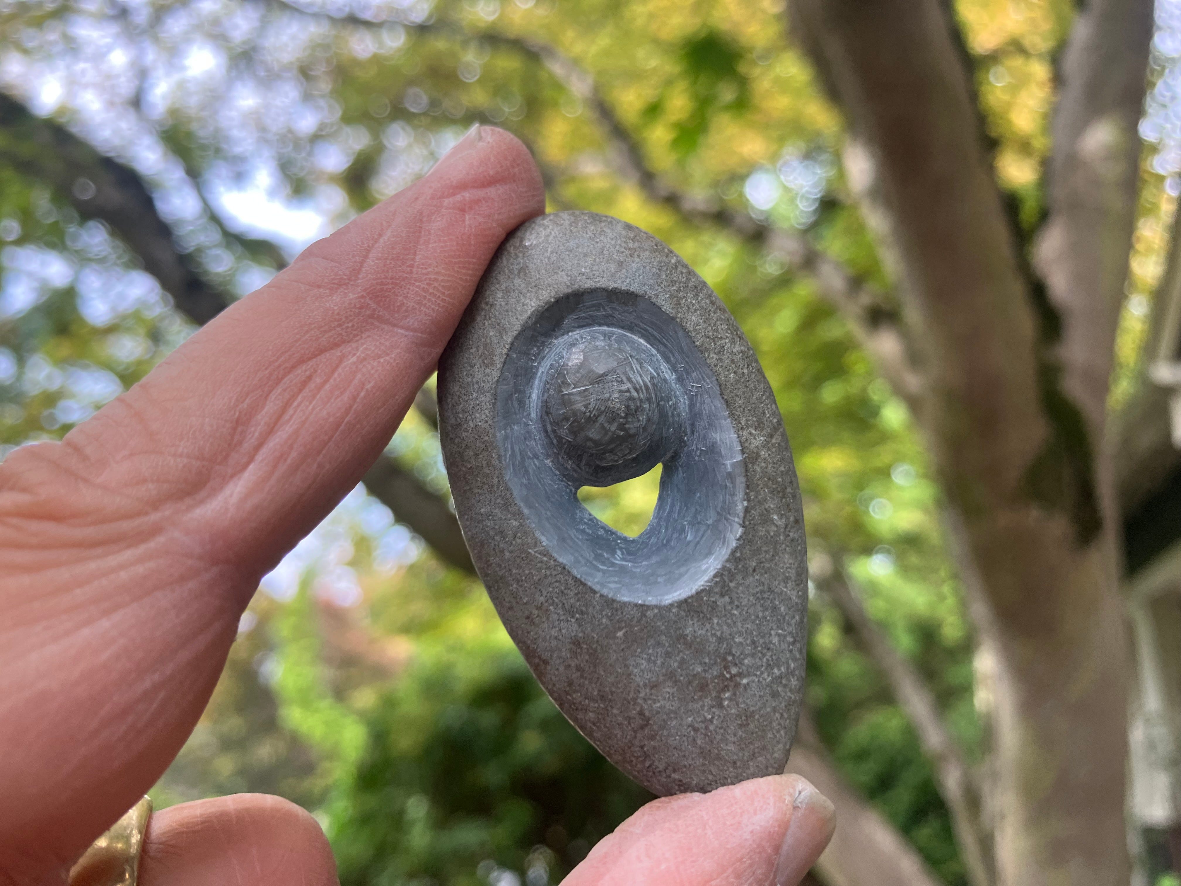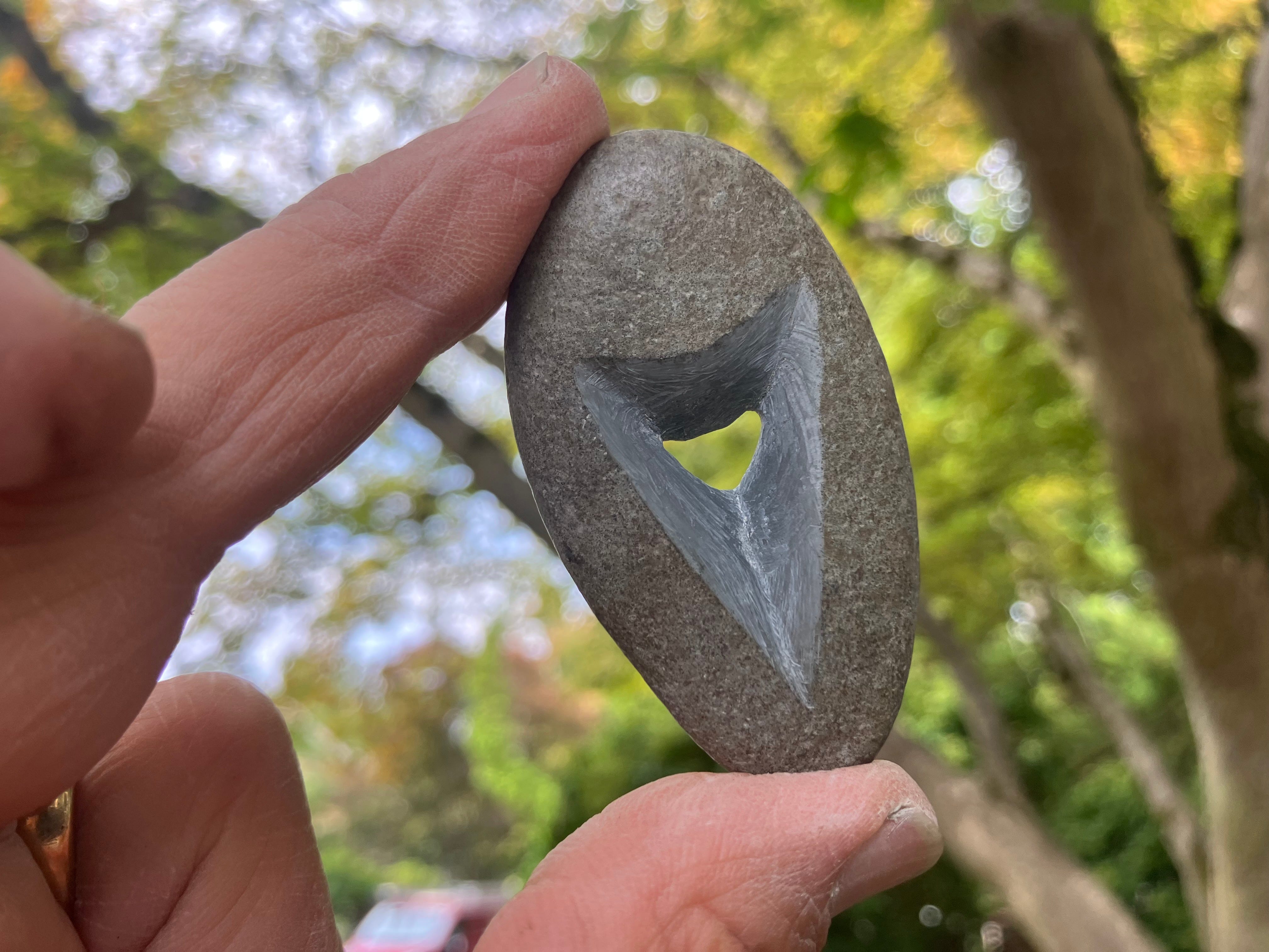 As you see, there are two sides to my carving, an unplanned change from my standard habit of always leaving one side of a stone untouched. At the time of carving it, I had no particular intention, just knew I needed to take my mind off my thoughts. Looking at it now, the two shapes give me ideas, start me thinking what they kinda look like. Mostly I just see the gap, the hole, the place and thing that allowed me to feel free, to feel like me again. And having it in hand, I think I will better remember what I need to do to give a window or “out” for my worries.